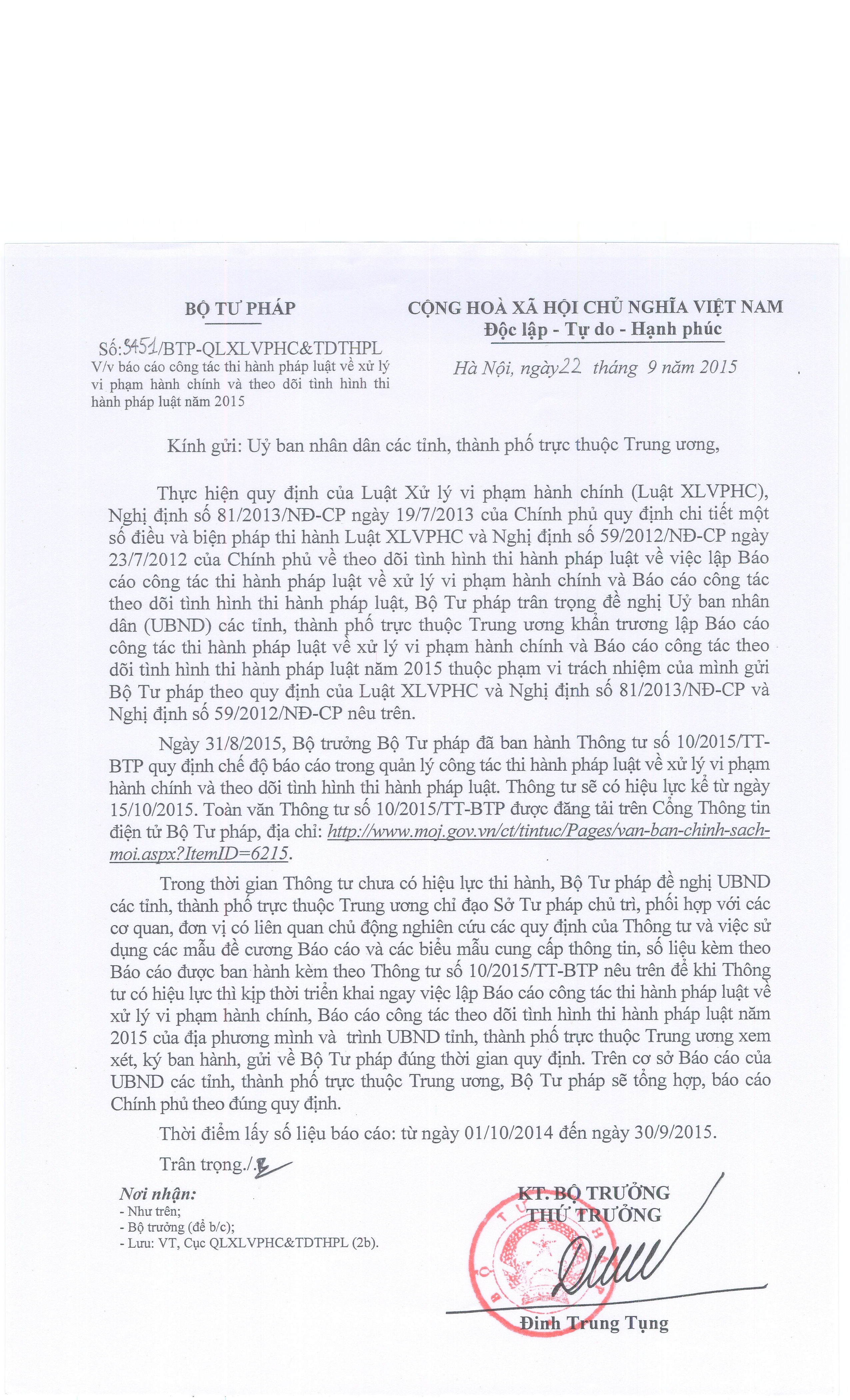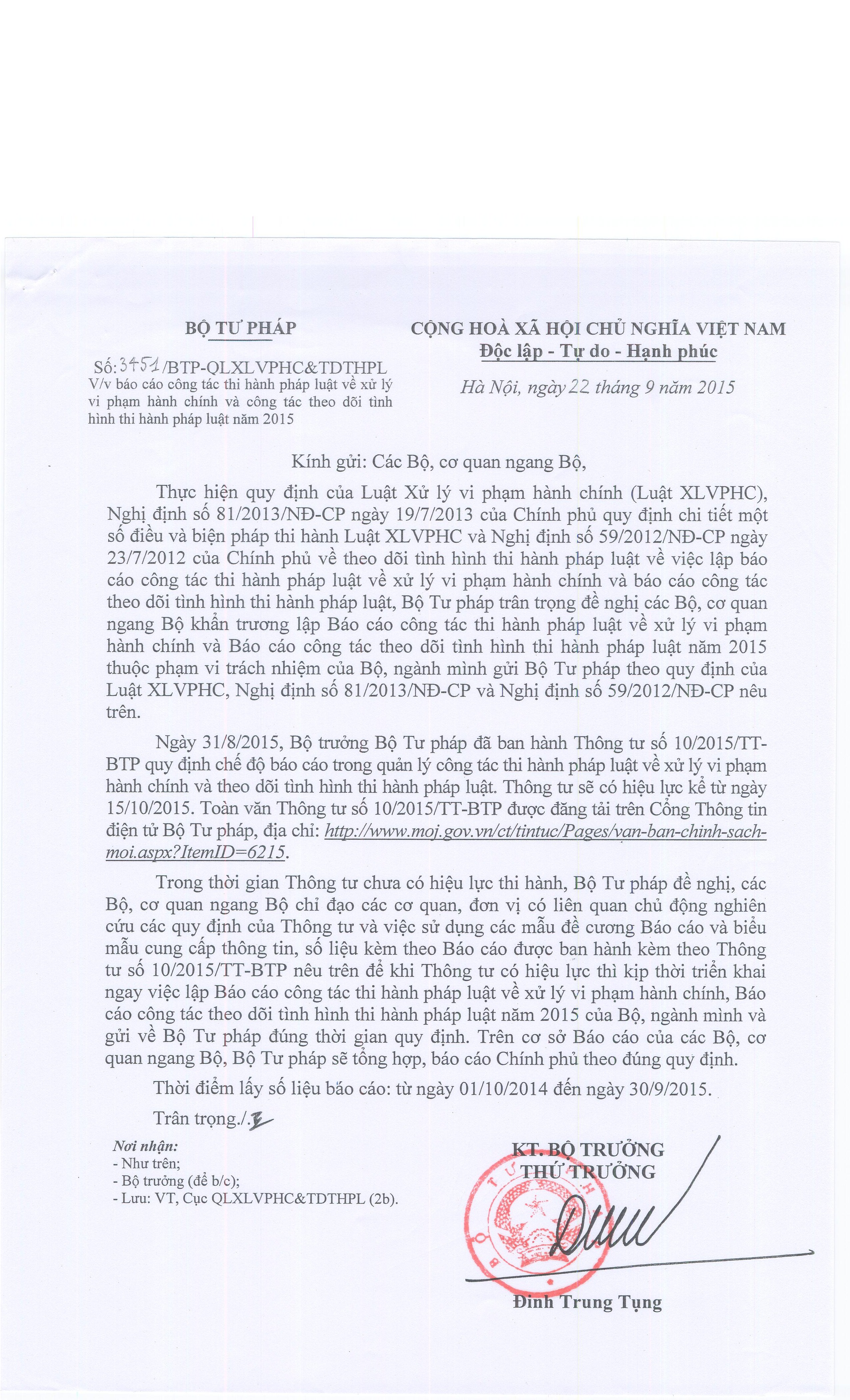 Để kịp thời triển khai việc lập Báo cáo công tác thi hành pháp luật về xử lý vi phạm hành chính và Báo cáo công tác theo dõi tình hình thi hành pháp luật năm 2015, ngày 22/9/2015, Bộ Tư pháp đã có Công văn số 3451/BTP-QLXLVPHC&TDTHPL gửi các Bộ, cơ quan ngang Bộ, UBND các tỉnh, thành phố trực thuộc Trung ương. Theo đó, Bộ Tư pháp đề nghị các Bộ, cơ quan ngang Bộ, UBND các tỉnh, thành phố trực thuộc Trung ương chỉ đạo các cơ quan, đơn vị có liên quan chủ động nghiên cứu các quy định của Thông tư và việc sử dụng các mẫu đề cương Báo cáo và biểu mẫu cung cấp thông tin, số liệu kèm theo Báo cáo được ban hành kèm theo Thông tư số 10/2015/TT-BTP nêu trên để khi Thông tư có hiệu lực thì triển khai ngay việc lập Báo cáo công tác thi hành pháp luật về xử lý vi phạm hành chính Báo cáo công tác theo dõi tình hình thi hành pháp luật năm 2015 của Bộ, ngành, địa phương mình và gửi về Bộ Tư pháp đúng thời gian quy định.