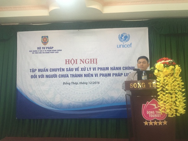 Trong khuôn khổ hoạt động của Dự án Hệ thống tư pháp thân thiện với người chưa thành niên (Chương trình hợp tác Việt Nam – Unicef). Trong các ngày 20 và 21/12/2016, tại Đồng Tháp, Cục Quản lý xử lý vi phạm hành chính và theo dõi thi hành pháp luật đã tổ chức “Hội nghị tập huấn chuyên sâu về xử lý vi phạm hành chính đối với người chưa thành niên vi phạm pháp luật” nhằm bồi dưỡng kiến thức chuyên môn, nghiệp vụ, các kỹ năng chuyên sâu và giải quyết những khó khăn, vướng mắc trong thực tiễn áp dụng pháp luật về xử lý vi phạm hành chính đối với người chưa thành niên vi phạm pháp luật và Đồng chí Lê Thanh Bình, Phó Cục trưởng Cục Quản lý xử lý vi phạm hành chính và theo dõi thi hành pháp luật, Bộ Tư pháp đã phát biểu khai mạc Hội nghị và trực tiếp truyền đạt một số chuyên đề tại Hội nghị tập huấn. Tham dự Hội nghị tập huấn là đại diện Sở Lao động - Thương binh và Xã hội và các đại biểu trực tiếp làm công tác quản lý xử lý vi phạm hành chính đối với người chưa thành niên như: Công chức Tư pháp - Hộ tịch, Công an và Cộng tác viên công tác xã hội của 18 xã, phường trên địa bàn huyện Cao Lãnh, tỉnh Đồng Tháp.