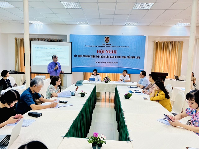 Thực hiện Kế hoạch công tác năm 2023 của Cục Quản lý xử lý vi phạm hành chính và theo dõi thi hành pháp luật (Quyết định số 62/QĐ-BTP ngày 18/01/2023 của Bộ trưởng Bộ Tư pháp), ngày 20/10/2023, Cục Quản lý xử lý vi phạm hành chính và theo dõi thi hành pháp luật (Cục QLXLVPHC&TDTHPL), Bộ Tư pháp đã tổ chức Hội nghị “Xây dựng và hoàn thiện thể chế về cắt giảm chi phí tuân thủ pháp luật” tại Thành phố Hà Nội. Chủ trì Hội nghị là ông Nguyễn Quốc Hoàn, Cục trưởng Cục QLXLVPHC&TDTHPL và bà Nguyễn Thị Minh Phương, Phó Cục trưởng Cục QLXLVPHC&TDTHPL, Bộ Tư pháp.