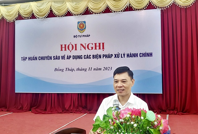 Nhằm tăng cường các kỹ năng, kiến thức pháp luật chuyên sâu về áp dụng các biện pháp xử lý hành chính cho các cán bộ, công chức trực tiếp thực hiện công tác này tại các tỉnh Đồng Tháp, Long An và An Giang, trong các ngày 15-16/11/2023, Cục Quản lý xử lý vi phạm hành chính và theo dõi thi hành pháp luật, Bộ Tư pháp (Cục QLXLVPHC&TDTHPL) đã tổ chức Hội nghị tập huấn chuyên sâu về áp dụng các biện pháp xử lý hành chính tại tỉnh Đồng Tháp. Đồng chí Nguyễn Quốc Hoàn, Cục trưởng Cục QLXLVPHC&TDTHPL, Bộ Tư pháp chủ trì Hội nghị.