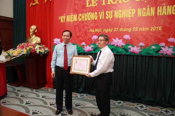 Cũng tại buổi làm việc nêu trên, nhân kỷ niệm 65 năm thành lập ngành Ngân hàng Việt Nam, Thống đốc Ngân hàng Nhà nước Việt Nam đã trao tặng “Kỷ niệm chương vì sự nghiệp Ngân hàng Việt Nam” cho Thứ trưởng Đinh Trung Tụng. Thay mặt Lãnh đạo Ngân hàng Nhà nước, Phó Thống đốc Đào Minh Tú ghi nhận và cảm ơn Thứ trưởng Đinh Trung Tụng vì những đóng góp tích cực của Ông đối với sự trưởng thành, phát triển của ngành Ngân hàng Việt Nam trong những năm qua./.