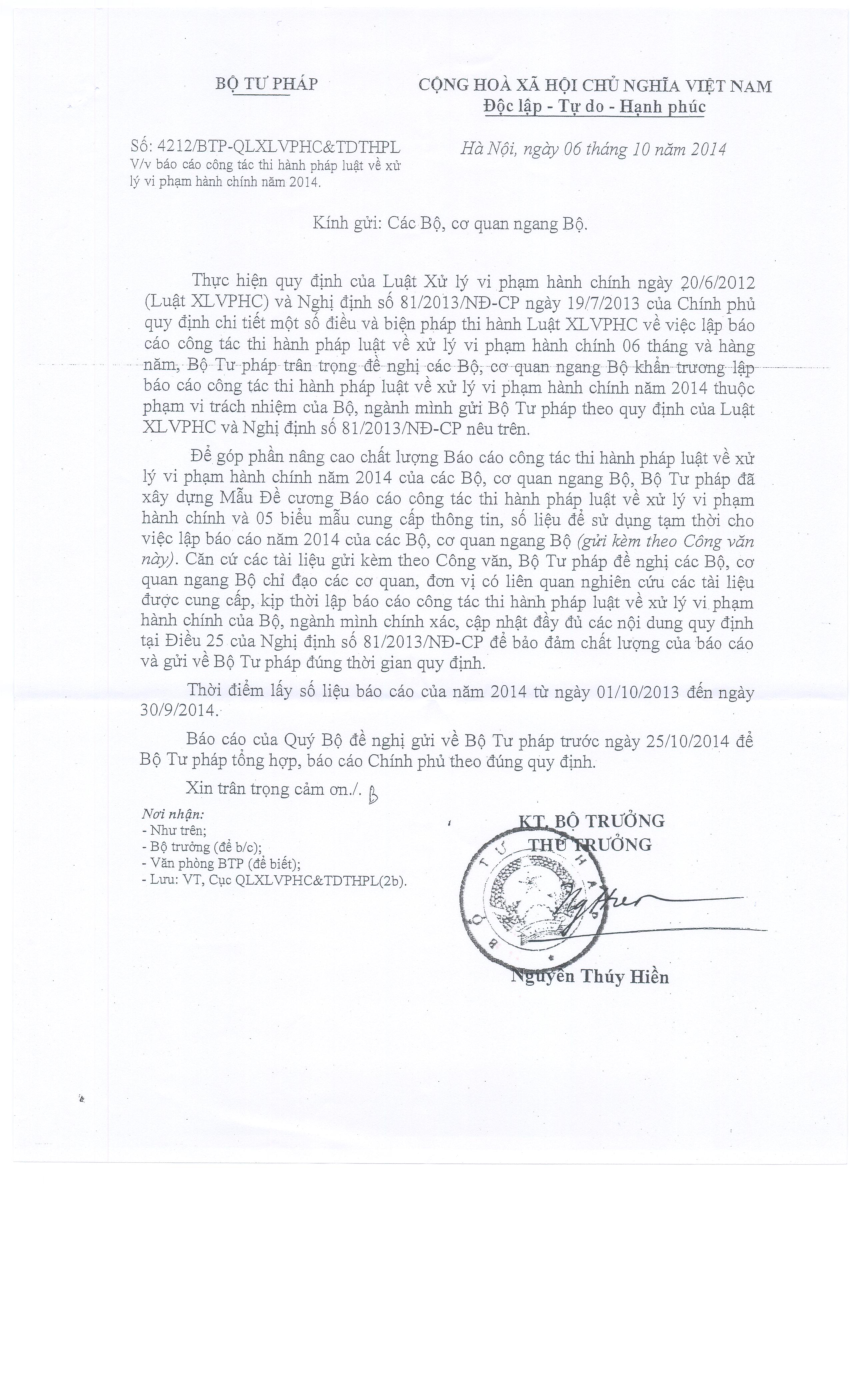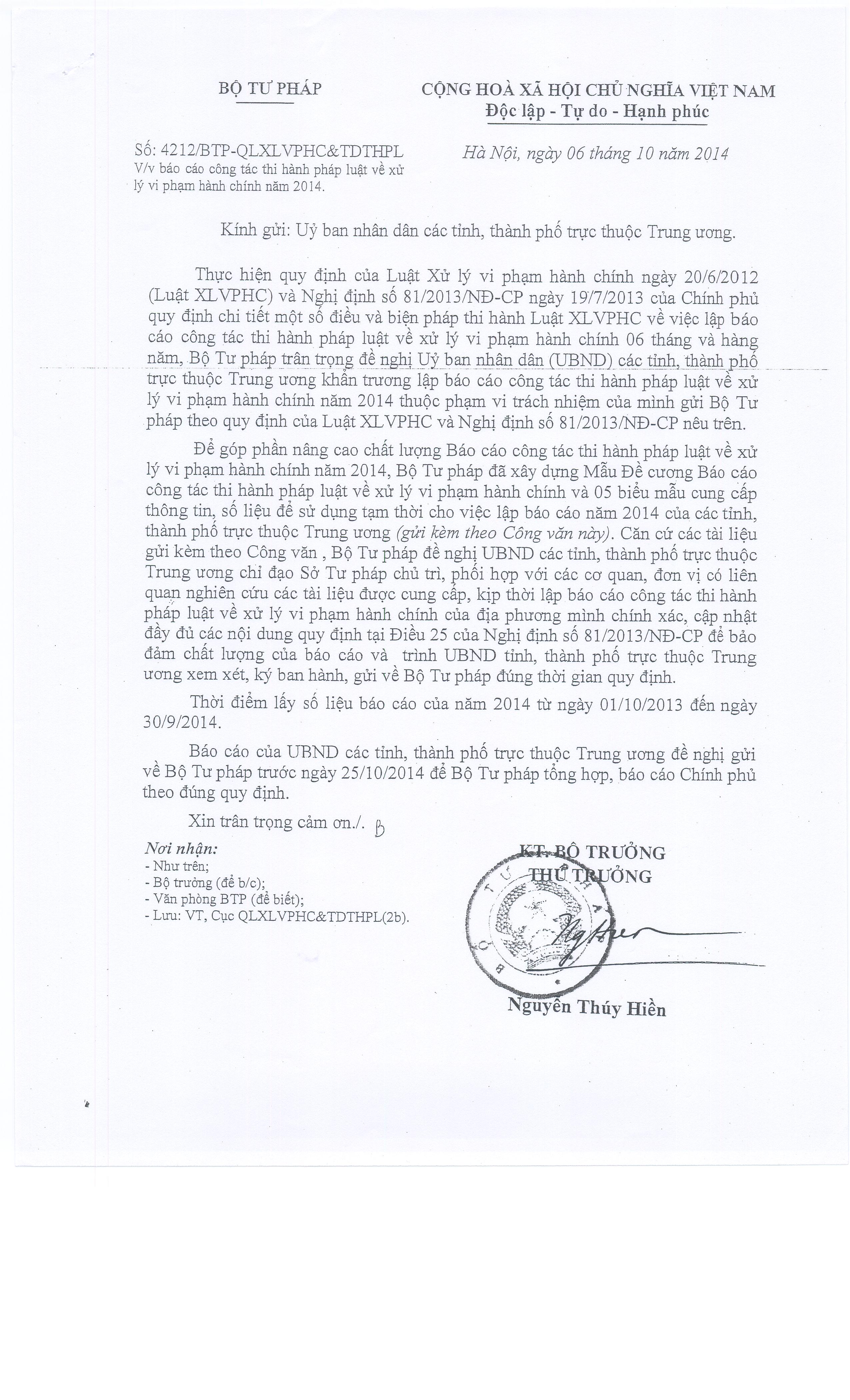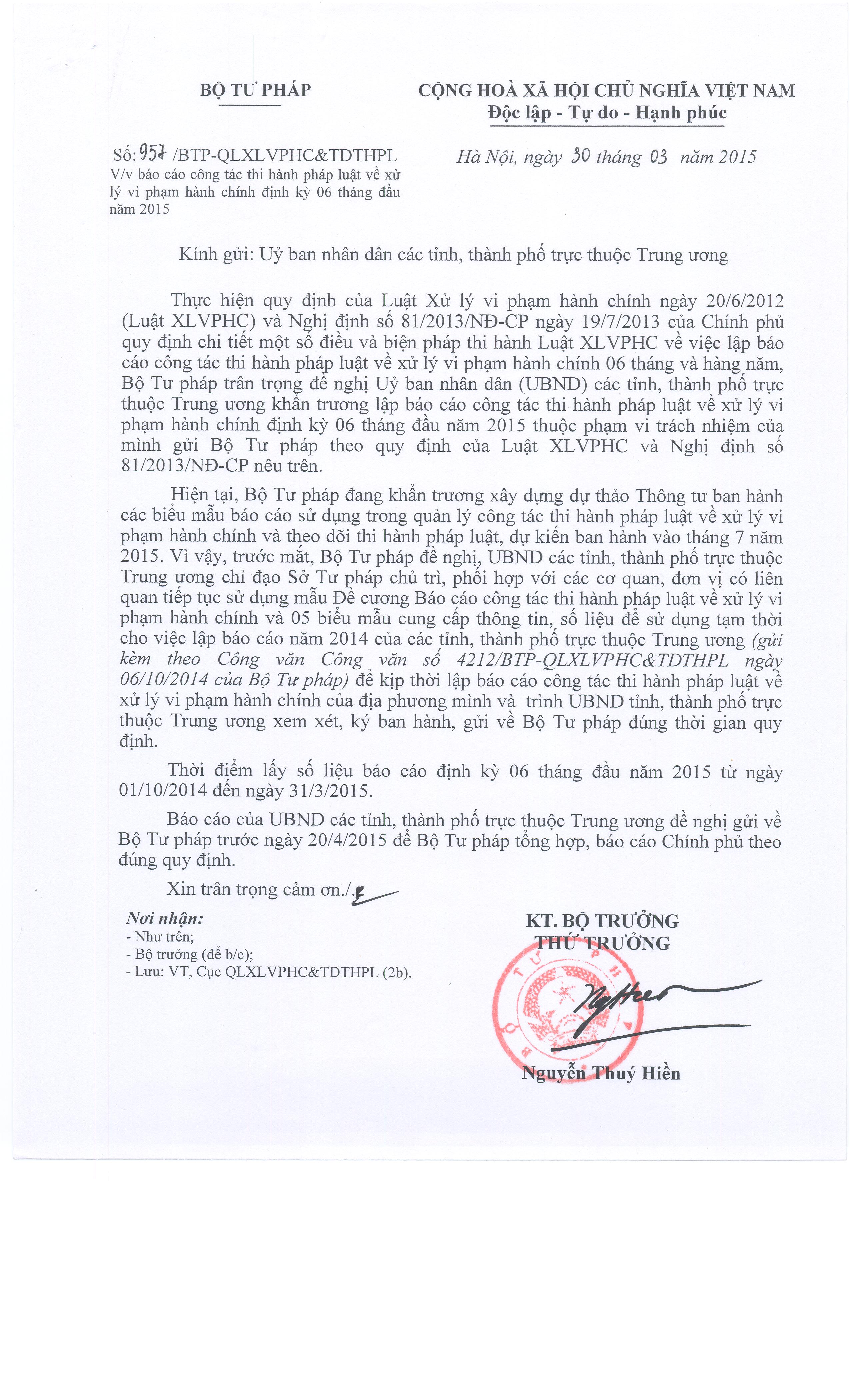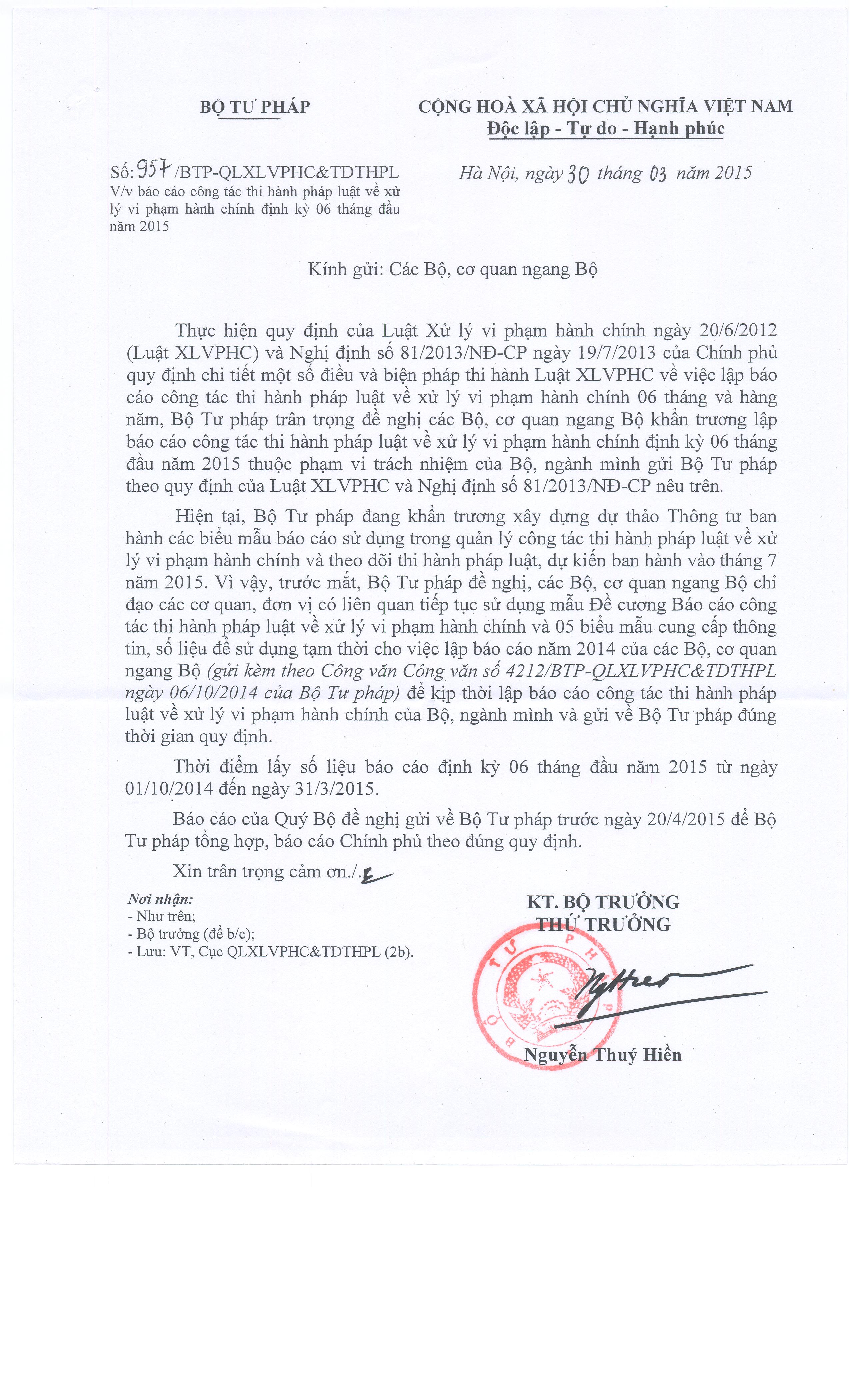 Báo cáo của Quý cơ quan đề nghị gửi về Bộ Tư pháp trước ngày 20/4/2015 để Bộ Tư pháp tổng hợp, báo cáo Chính phủ theo đúng quy định.