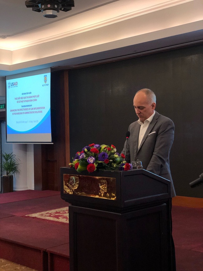 Tiếp theo Chương trình hợp tác về pháp luật năm 2018 đã được Lãnh đạo Bộ Tư pháp phê duyệt, trong 1,5 ngày 15-16/11/2018, Cục Quản lý xử lý vi phạm hành chính và theo dõi thi hành pháp luật, Bộ Tư pháp và Dự án “Quản trị Nhà nước nhằm tăng trưởng toàn diện” (GIG) của Cơ quan Phát triển Quốc tế Hoa Kỳ USAID đã tổ chức thành công Hội nghị tập huấn "Thúc đẩy hiệu quả thi hành pháp luật về xử phạt vi phạm hành chính" nhằm tăng cường các kiến thức pháp luật chuyên sâu cho các đại biểu trực tiếp làm công tác xử phạt vi phạm hành chính và quản lý công tác thi hành pháp luật về xử lý vi phạm hành chính.