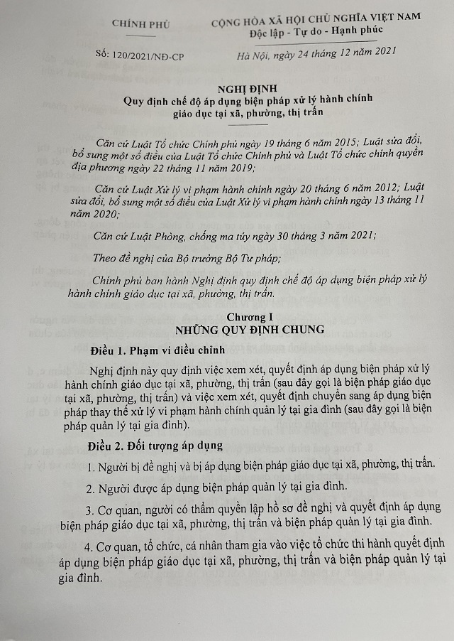 Ngày 24/12/2021, Chính phủ đã ban hành Nghị định số 120/2021/NĐ-CP quy định chế độ áp dụng biện pháp giáo dục tại xã, phường thị trấn (GDTXPTT). Nghị định số 120/2021/NĐ-CP được ban hành nhằm bảo đảm phù hợp với quy định của Luật số 67/2020/QH14 sửa đổi, bổ sung một số điều của Luật Xử lý vi phạm hành chính, đồng thời, khắc phục những vướng mắc, bấp cập xuất phát từ các quy định của Nghị định số 111/2013/NĐ-CP ngày 30/9/2013 của Chính phủ quy định chế độ áp dụng biện pháp GDTXPTT và Nghị định số 56/2016/NĐ-CP ngày 29/6/2016 của Chính phủ sửa đổi, bổ sung một số điều của Nghị định số 111/2013/NĐ-CPCP và những khó khăn, vướng mắc phát sinh trong thực tiễn tổ chức thi hành biện pháp này.
