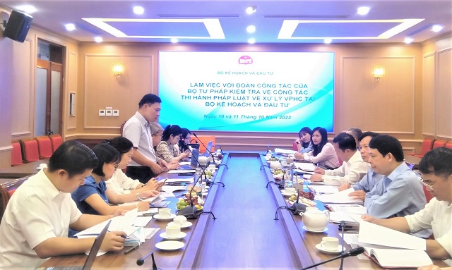 Thực hiện Quyết định số 1363/QĐ-BTP ngày 17/7/2023 của Bộ trưởng Bộ Tư pháp về kiểm tra công tác thi hành pháp luật về xử lý vi phạm hành chính năm 2023 (được sửa đổi, bổ sung tại Quyết định số 2206/QĐ-BTP ngày 14/9/2023), trong các ngày 10/10/2023 và ngày 11/10/2023, Đoàn kiểm tra liên ngành của Bộ Tư pháp do Thứ trưởng Đặng Hoàng Oanh làm Trưởng đoàn đã tiến hành kiểm tra công tác thi hành pháp luật về xử lý vi phạm hành chính tại Bộ Kế hoạch và Đầu tư. Thành phần Đoàn kiểm tra gồm đại diện Bộ Tư pháp (Cục Quản lý xử lý vi phạm hành chính và theo dõi thi hành pháp luật, Thanh tra Bộ Tư pháp) và đại diện Bộ Công an.