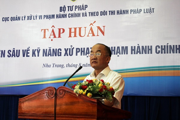 Trên cơ sở được sự đồng ý của Lãnh đạo Bộ Tư pháp, trong các ngày 20-21/8/2019, Cục Quản lý xử lý vi phạm hành chính và theo dõi thi hành pháp luật đã tổ chức Lớp thí điểm tập huấn chuyên sâu về kỹ năng xử phạt vi phạm hành chính tại thành phố Nha Trang, tỉnh Khánh Hòa. Đồng chí Đặng Thanh Sơn - Cục trưởng Cục Quản lý xử lý vi phạm hành chính và theo dõi thi hành pháp luật phát biểu khai mạc và trực tiếp giảng dạy.