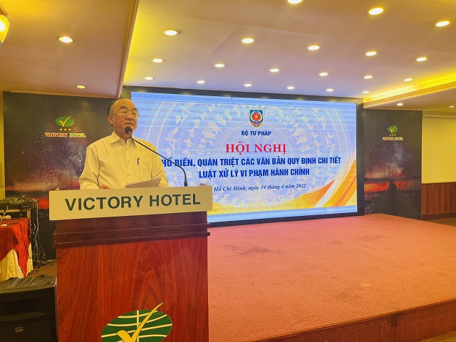 Thực hiện Quyết định số 508/QĐ-BTP ngày 04/4/2022 của Bộ trưởng Bộ Tư pháp và thực hiện triển khai đồng bộ, hiệu quả các văn bản hướng dẫn Luật XLVPHC mới được ban hành trong thời gian qua, ngày 14/4/2022, Bộ Tư pháp tiếp tục tổ chức “Hội nghị phổ biến, quán triệt các văn bản quy định chi tiết Luật Xử lý vi phạm hành chính” tại thành phố Hồ Chí Minh do đồng chí Đặng Thanh Sơn – Cục trưởng Cục Quản lý xử lý vi phạm hành chính và theo dõi thi hành pháp luật chủ trì.
