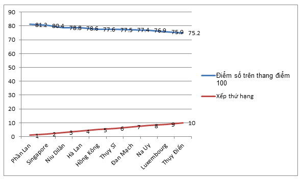 Bảng 1: 10 quốc gia có điểm số và thứ hạng trụ cột thể chế cao nhất năm 2018